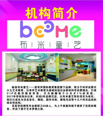 2017年学校创办以来,历经2年品牌沉淀,以布米童艺特色项目为依托,成长为涉及音乐、舞蹈、国学书画、硬笔书法等十几个科目品类的综合性机构。